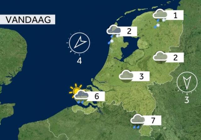 Eerst het weer: In het noorden valt nog enige tijd sneeuw en regionaal ontstaat een dun sneeuwdek. Het wordt er maximaal 1 graad. Elders is het grijs, vaak droog en 2 tot 7 graden.